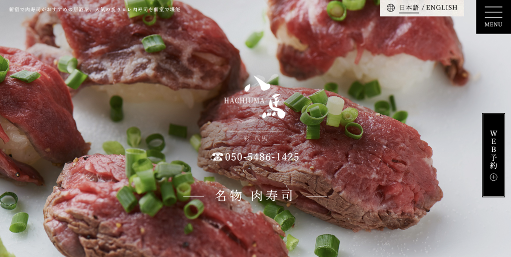 GODZILLA ROADを天下一品の角で右折、公園の向かい、右手のビル5Fです。A5ランク国産黒毛和牛を使用した、肉寿司をはじめとした肉料理、もつ鍋、しゃぶしゃぶ、すき焼き、水炊きといった鍋。千葉の漁港から直送の鮮魚、逸品料理など様々な料理が楽しめる『肉寿司 彩・八馬 新宿店』さん。