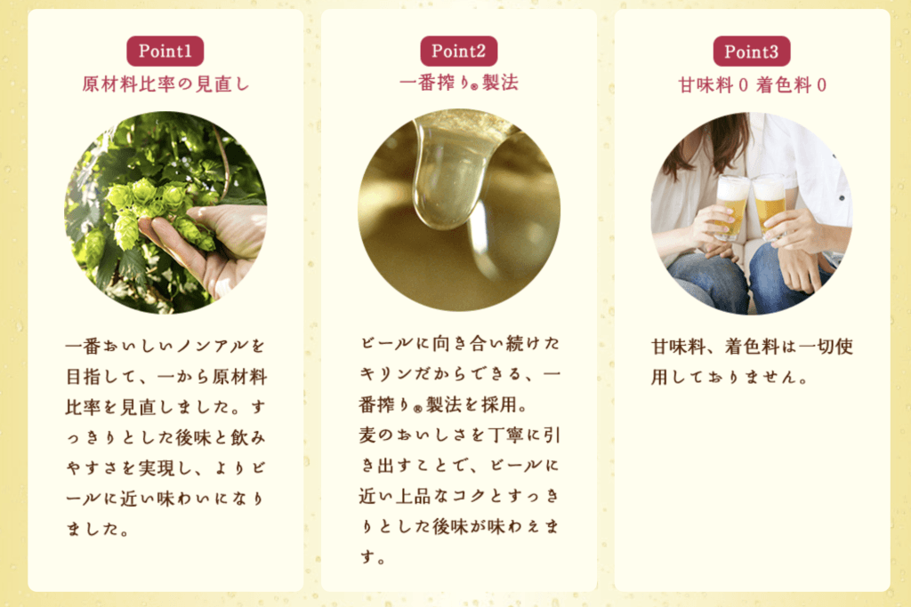 その点、キリンゼロイチは、ノンアルコール飲料であるにもかかわらず、アルコール好きの人も楽しめる味わいになっているのです。
