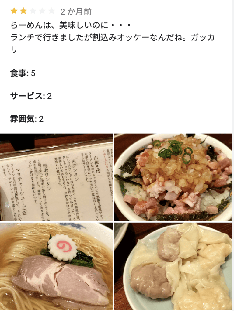 ラーメン屋なので、回転率がいいと思い並ぶも、回転率が悪くがっかりしたという意見です。