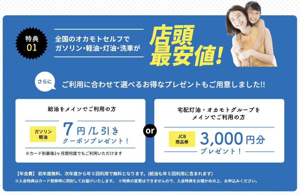 カード利用でガソリン代が店頭最安値となり、入会後2ヶ月間はガソリン・軽油が7円/L引きなどの特典もあります。