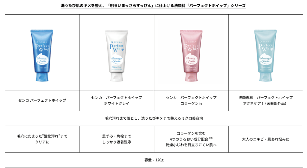 - パーフェクトホイップ: シリーズの基本商品。きめ細かい泡で、肌を優しく洗い上げます。