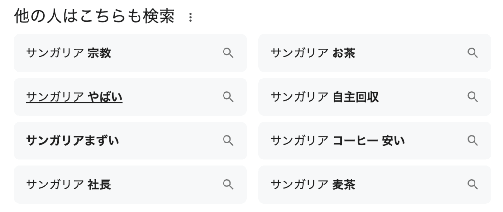 しかし、そんなサンガリアは「宗教と関係があるのでは」という噂が浮上しており、ネット上で「サンガリア」と検索すると「宗教」などと表示されるのです。