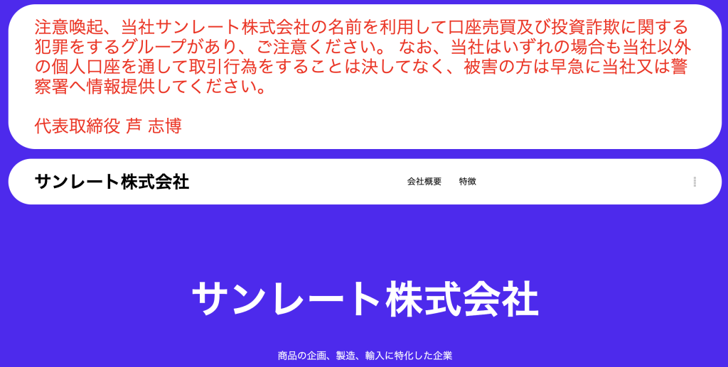 第一に、サンレート株式会社自身が、自社のウェブサイトで「当社サンレート株式会社の名前を利用して口座売買及び投資詐欺に関する犯罪をするグループがあり、ご注意ください」という注意喚起を行っています。